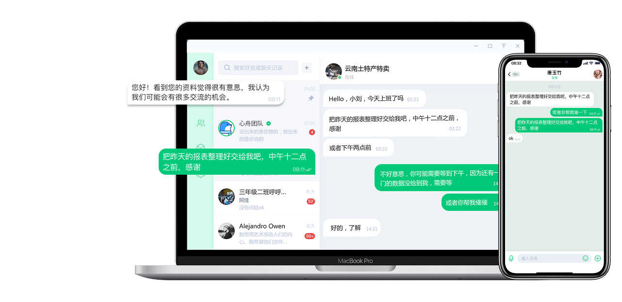 支持单聊、群聊、朋友圈、强大群管理功能、双向清除、群发消息、协同办公等功能。